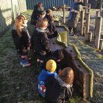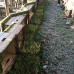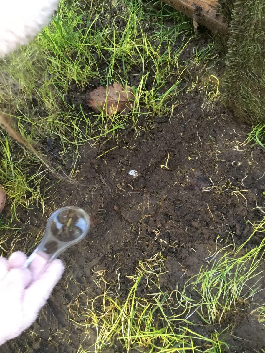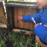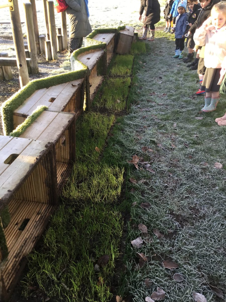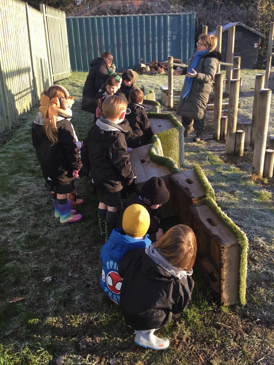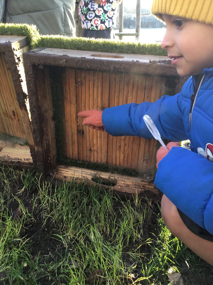Outside, we carefully lifted up the grass beams and found lots of mini-beasts hiding underneath. They were tucked away where it was warm and safe. The children noticed that the grass under the beams felt soft and not frosty, but the grass that wasn’t covered was cold and crunchy with frost.
